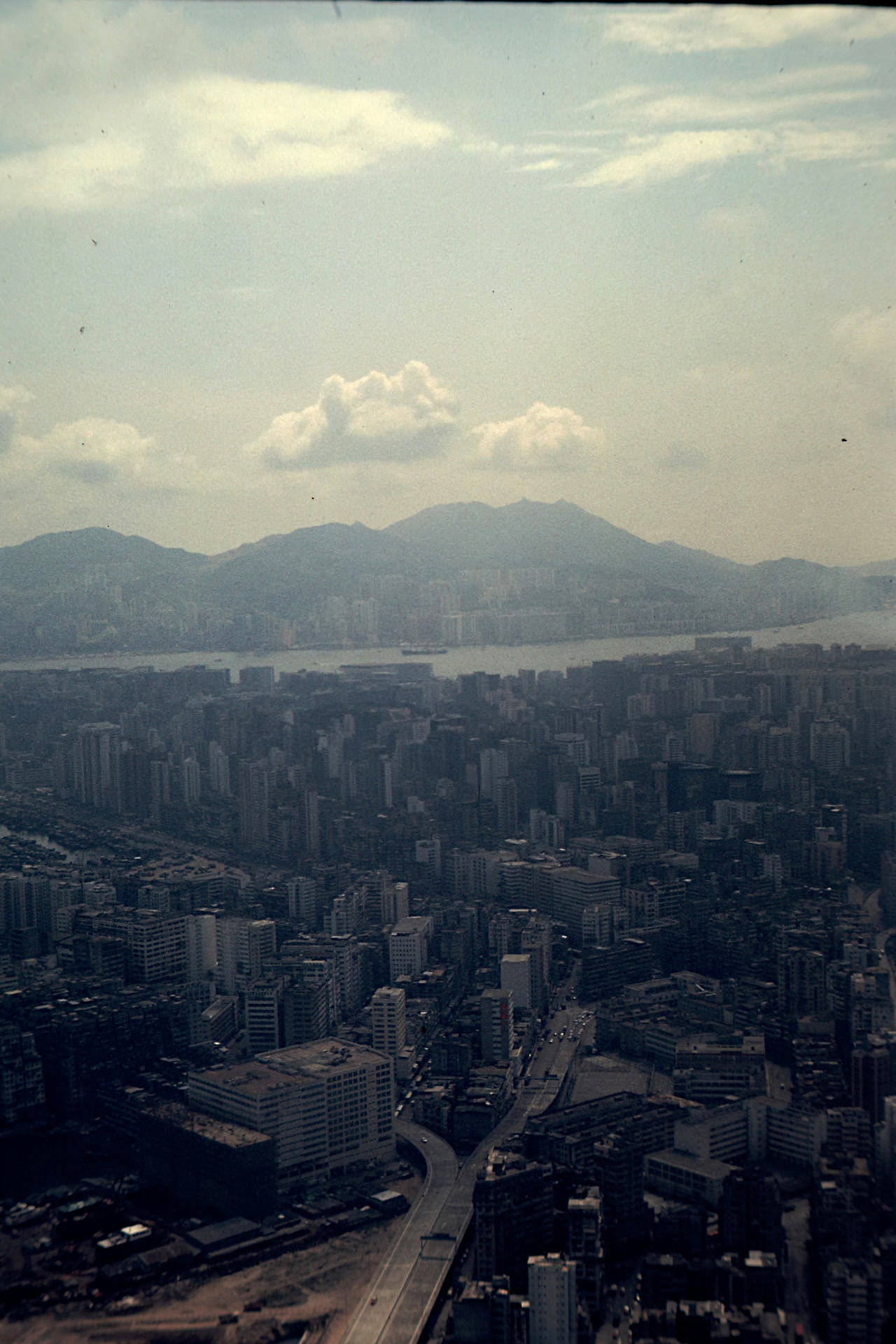 Anmerkung: Der Flug von Taipeh nach Hong Kong war gigantisch. Das Flugzeug, eine nagelneue 757 von Boeing, war fast leer und so konnte ich den Landeanflug auf den alten Flughafen von Hongkong richtig genießen und fotografieren. Mit den heutigen Möglichkeiten hätte man hunderte Fotos gemacht, oder ein 4K-Video, damals musste ich sparsam sein. Die vier (!) Bilder zeigen die Phasen des Anflugs. Durch die seltsame Lage der Start- bzw. Landebahn durften nur Piloten mit einer besonderen Lizenz dort starten und landen. Kein Wunder.