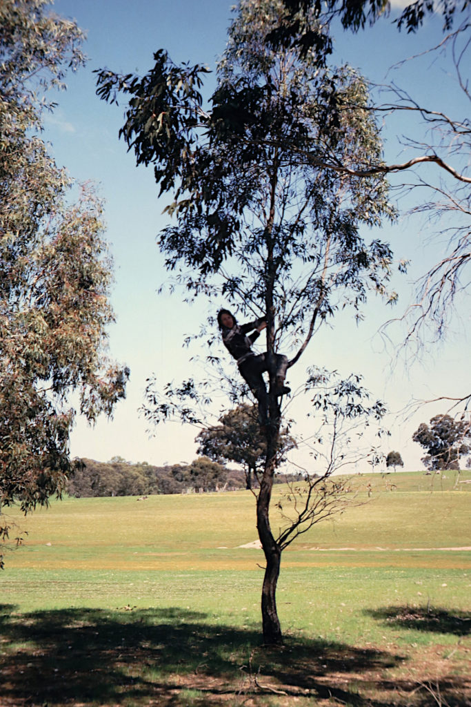 Das Bild zeigt mich am Vortag, in einem der Eukalyptusbäume auf dem in Aussicht stehenden Grundstücks herumkletternd. Das verleitete die mitreisenden Australier uns die dem deutschen Sprichwort „Vom Regen in die Traufe kommen“ entsprechende australische Variante zu erläutern. Im Englischen lautet diese „From the fying pan into the fire“ (etwa aus der Bratpfanne ins Feuer“ gelangen), im Australischen „To sit in a Gumtree“, also eher „in einer Klemme sitzen“, denn der Eukalyptusbaum brennt durch den hohen Anteil an ätherischen Ölen in den Blättern, wie Zunder und ist mithin kein guter Platz zum Überleben. Glücklicherweise war kein Feuer weit und breit in Sicht.