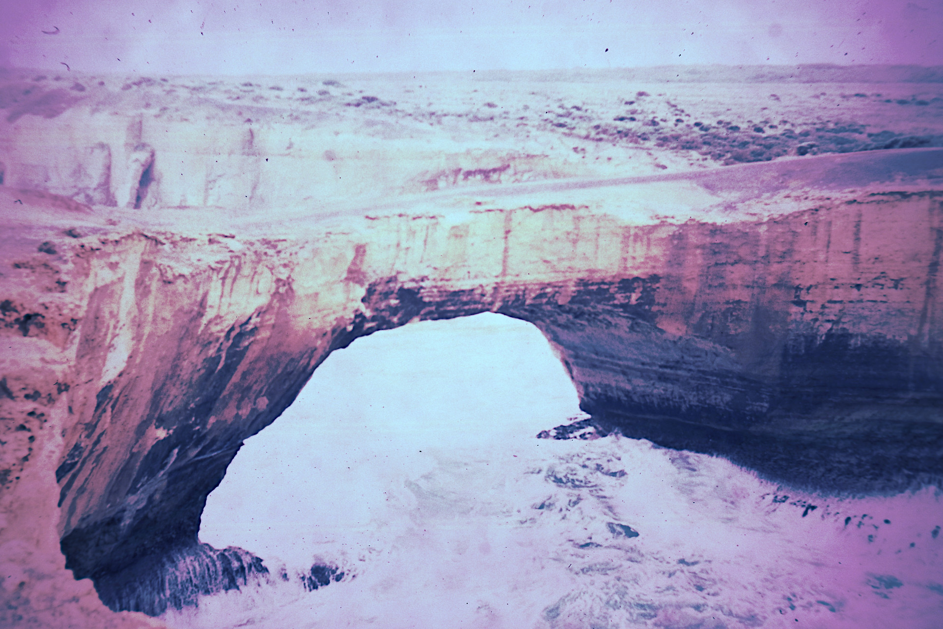 Das Dia der „London Bridge“ ist völlig überbelichtet, man erkennt im Original fast nichts. Durch geduldige digitale Bildbearbeitung erkennt man nun zumindestens den vom Wasser unterspülten Bogen. Als die Brücke 1990 zusammenbrach, mussten Besucher, die wie wir hinausgelaufen waren, mittels Hubschrauber gerettet werden.