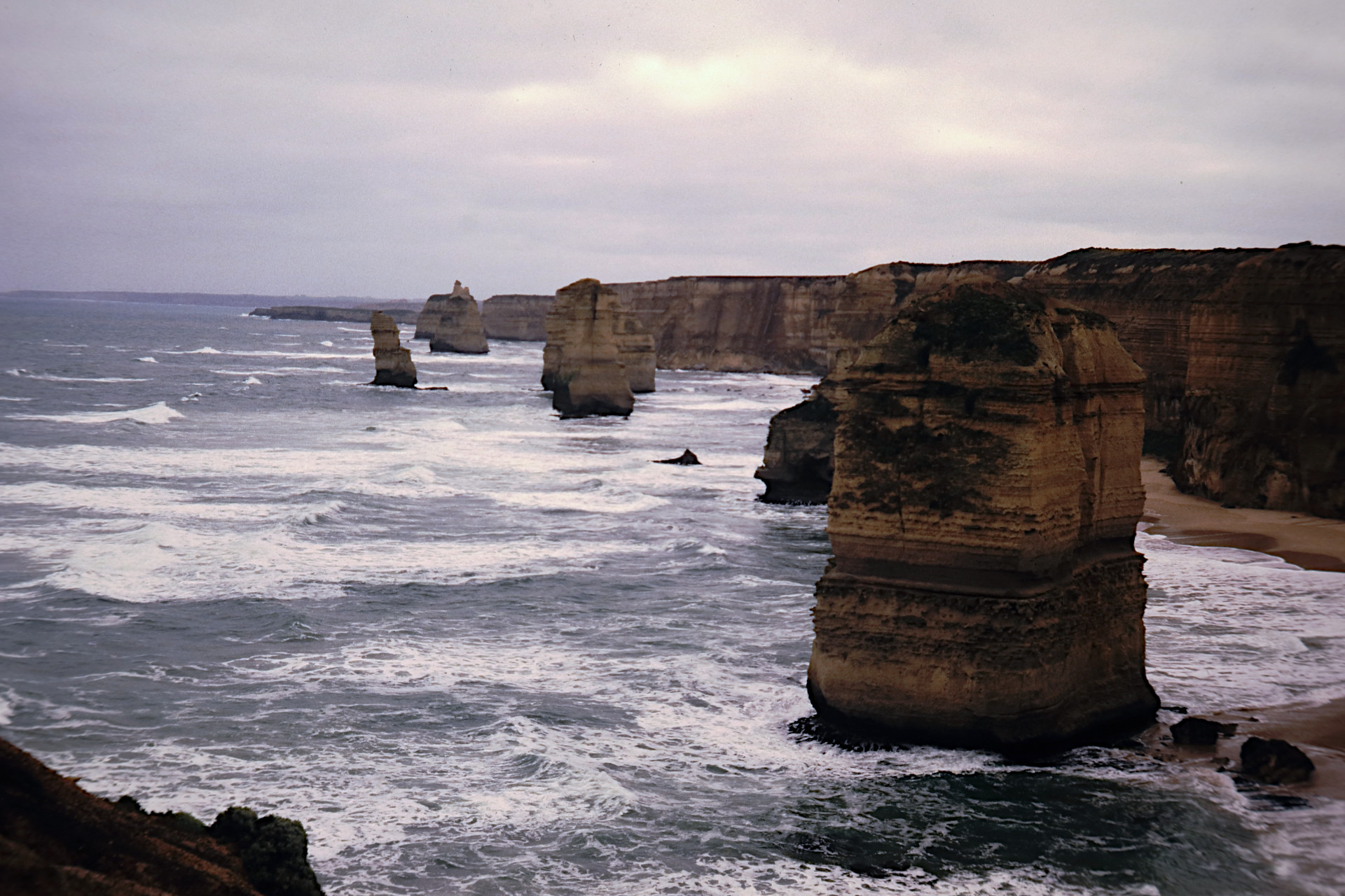 Anmerkung: Die „Zwölf Apostel“ sind kleine, steil aufragende Inseln im Meer. Teil der Formation waren auch die „London Bridge“, welche 1990 zusammenbrach und das „Blowing Hole“, welches etwa 100m von der Küste entfernt liegt, aber mit diesem durch eine Höhle verbunden ist.