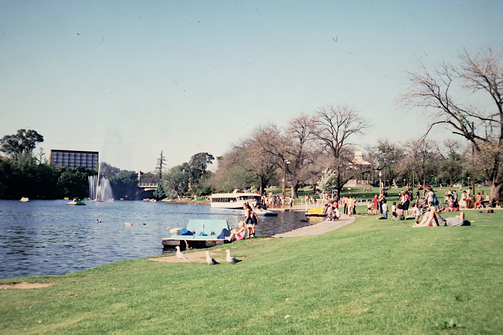 Das Foto zeigt den „Elder Park“ in Adelaide, im Hintergrund die historische Rotunde, links im Hintergrund das Krankenhaus.