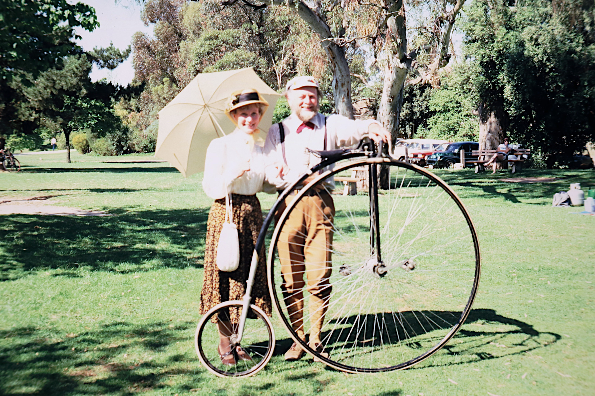 Das Foto zeigt ein Paar in historischen Kostümen und einem Hochrrad, sehr wahrscheinlich am Vortag im Elder Park aufgenommen. Hochhräder waren die Vorform des heute gebräuchlichen (und nicht mehr so benannten) Niederrades. Sie kamen mit weniger Teilen aus, insbesondere benötigten sie keine Umsetzung mittels Kette und Zahnräder, waren aber gefährlich zu fahren.