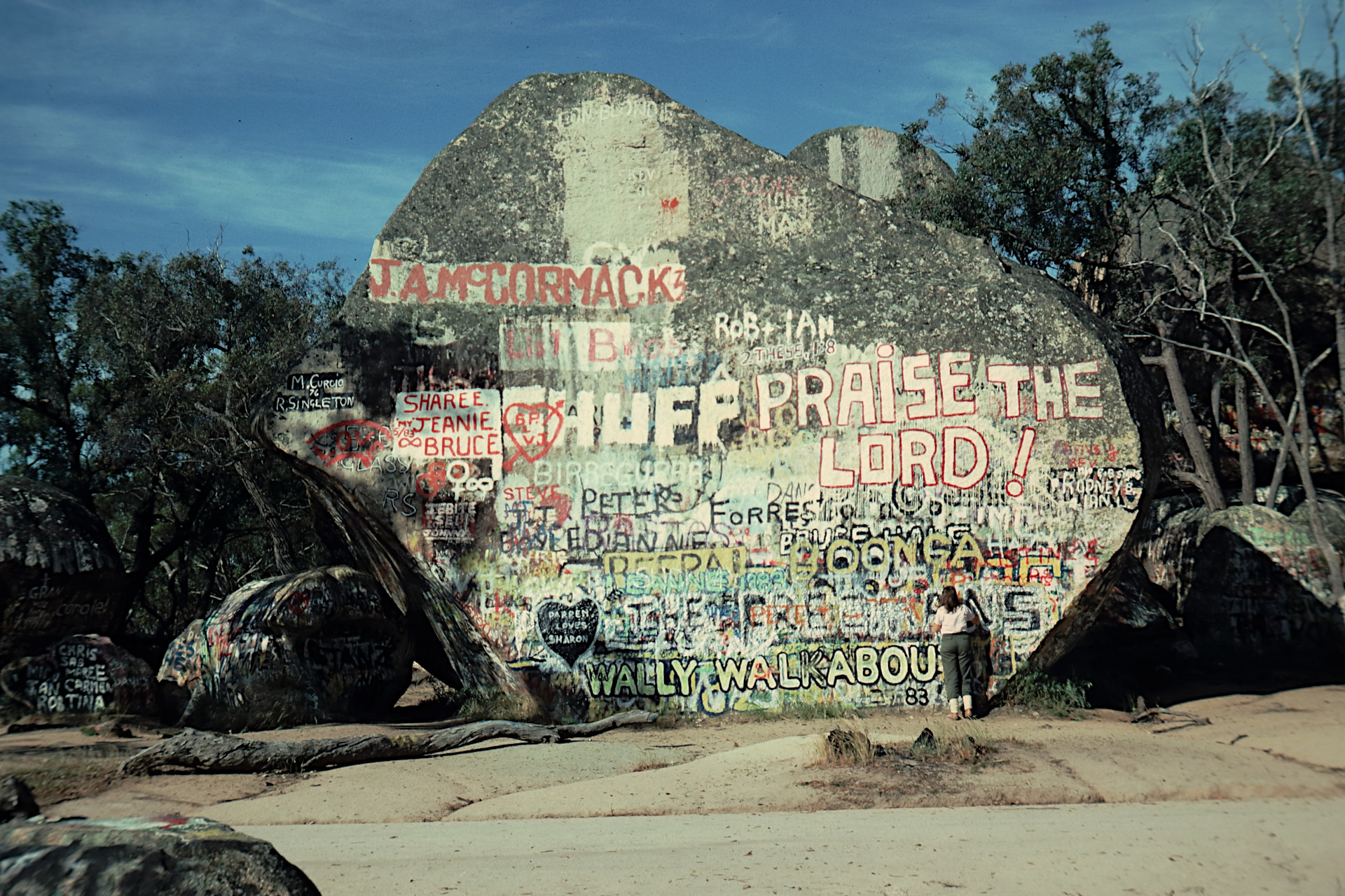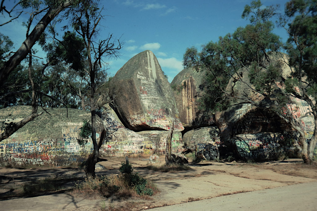 Anmerkung: Die Bilder zeigen den Sisters Rock, nicht weit vom Ort Stawell. Die bemalten Steine sollen nach der Überlieferung, bei der Verheiratung dreier Schwestern aus der Umgebung geholfen haben, quasi als Reklametafel. Die Steine wurden frühzeitig unter Denkmalschutz gestellt und sind deshalb erhalten geblieben. Es ist unwahrscheinlich, dass der Bus auf der Fahrt von Adelaide nach Ballarat dort gehalten hat, alleine schon deshalb, weil es keinerlei Restauration an dem Platz gibt. Aber vielleicht hat der Fahrer eine Bemerkung gemacht und wir haben deshalb beim Ausflug in die Grampions am morgigen Tag dort halt gemacht.