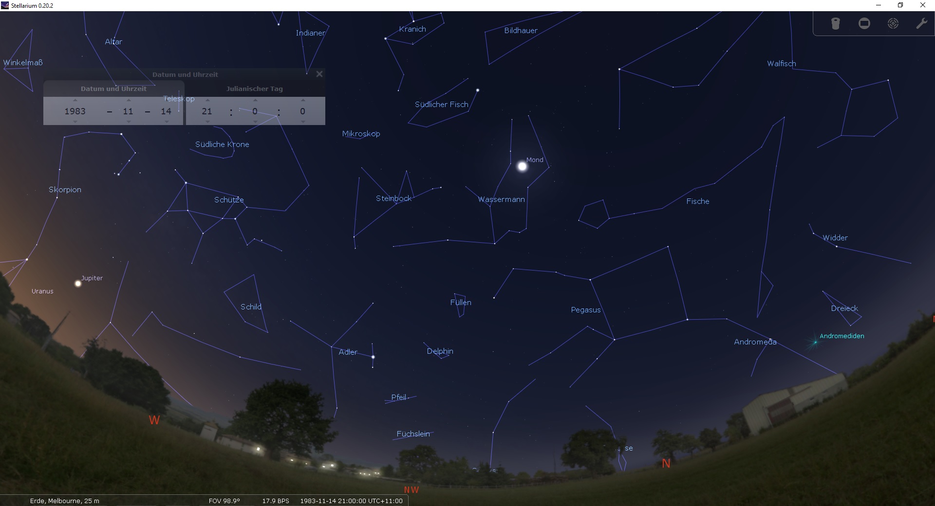 An den Spaziergang habe ich keine Erinnerung. Ort und Zeit im Programm Stellarium eingestellt ergibt das obige Bild: Der Mond, an diesem Tag ein zunehmender Halbmond, stand Abends hoch am Himmel, ein sicherlich romantischer Anblick!