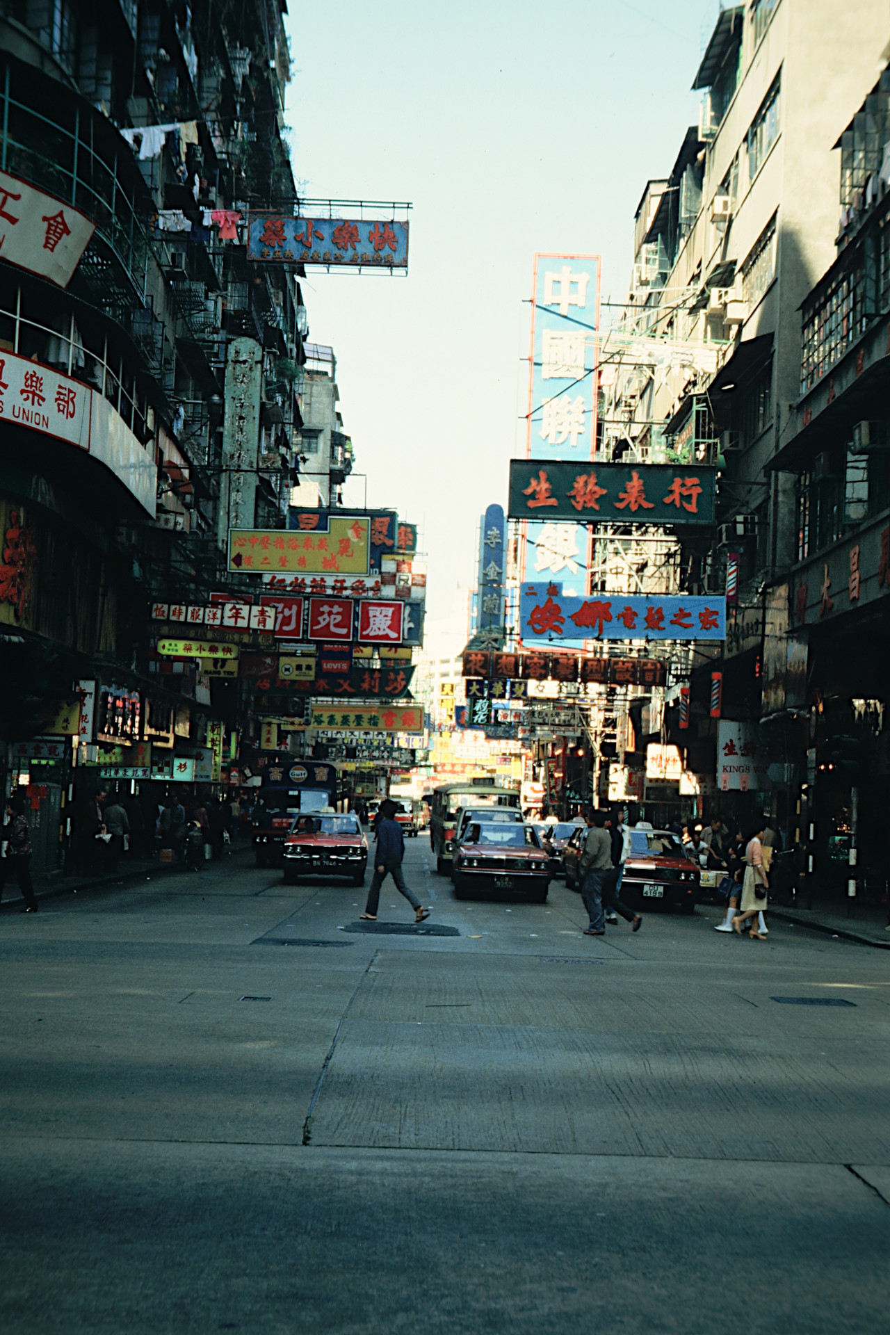 Das Foto zeigt noch einmal eine typische Straßenszene in Kowloon. Um das Foto zu machen, nutzte ich die Rot-Phase der Ampel und spurtete schnell wieder auf den Bürgersteig zurück.