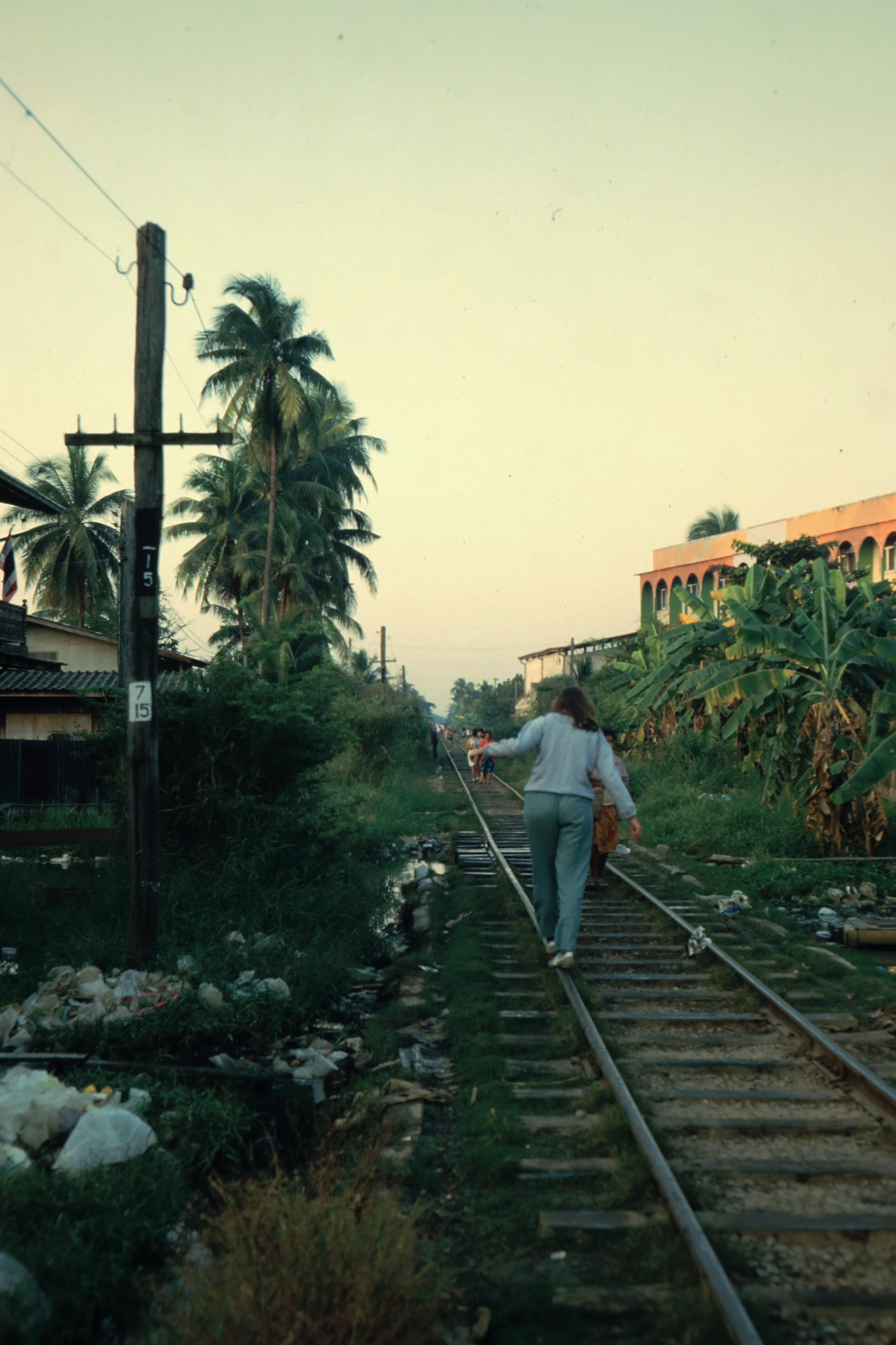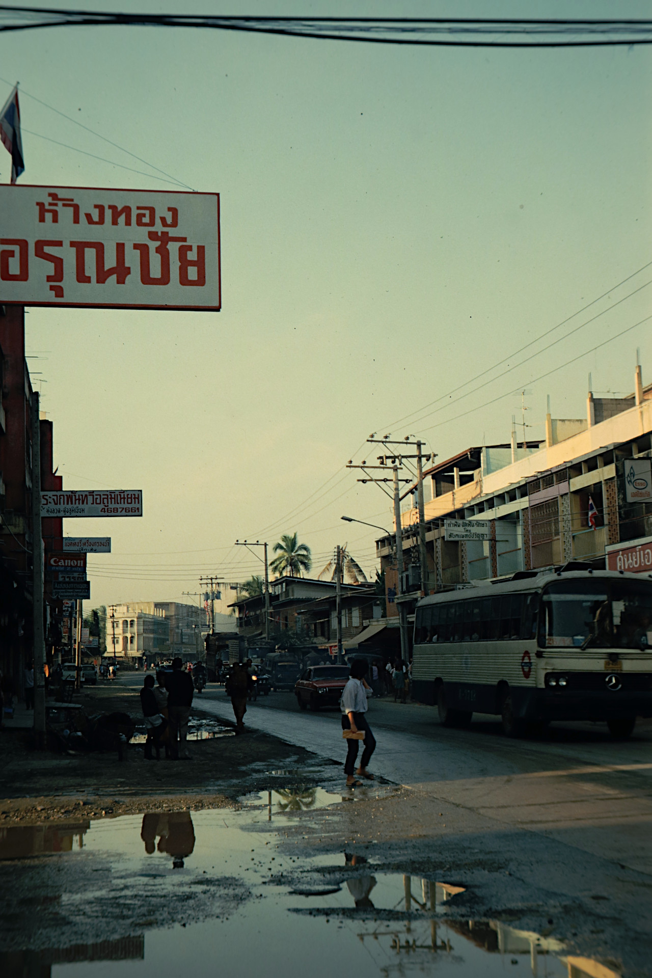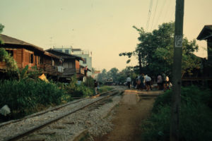 Ich habe versucht das auf der Karte im Buch und bei OpenStreetMap nachzuvollziehen. Es ist nicht ganz einfach. Und wir mussten ja auch erst zum General Post-Office. Auf dem Foto mit dem Bus, welches ich Euch auch schon vor einigen Tagen zeigte, kann man die Nummer 43 entdecken. Aber das Wasser stand so hoch, dass wir nicht bis zum Wat Sai gelangen konnten und deshalb den Schienen entlang einen anderen Weg suchten – vergeblich.