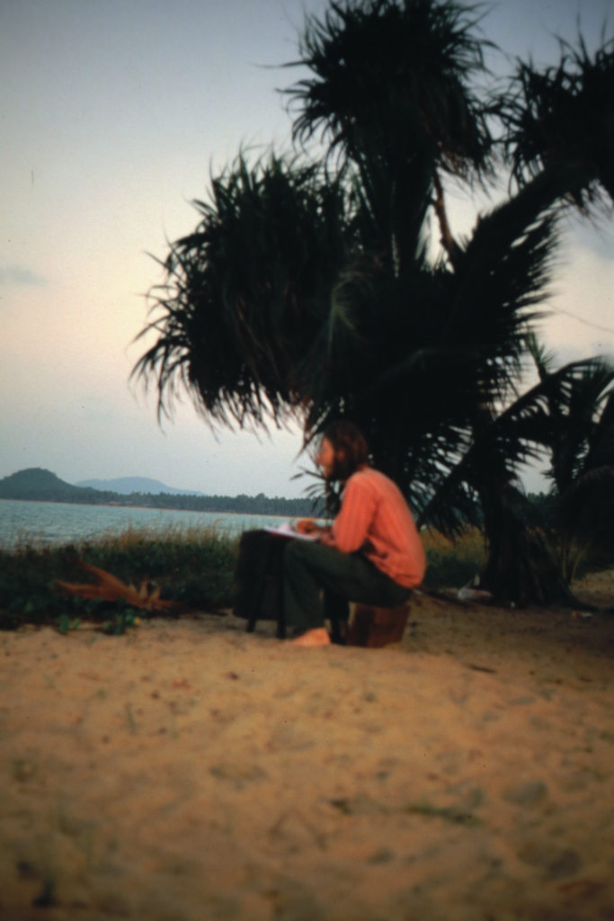 Das Foto zeigt mich bei unserer Unterkunft, Blick auf den Strand (Mae Nam Beach), offensichtlich am erwähnten „Buch“ schreibend. Die Gegend war völlig menschenleer, nackt baden völlig problemlos, denn außer uns war da niemand. Der Vergleich mit heute ist wieder mit Google Streetview möglich. Im Hintergrund sieht man die beiden markanten Berge, anhand derer ich die Position einigermaßen rekonstruieren konnte.