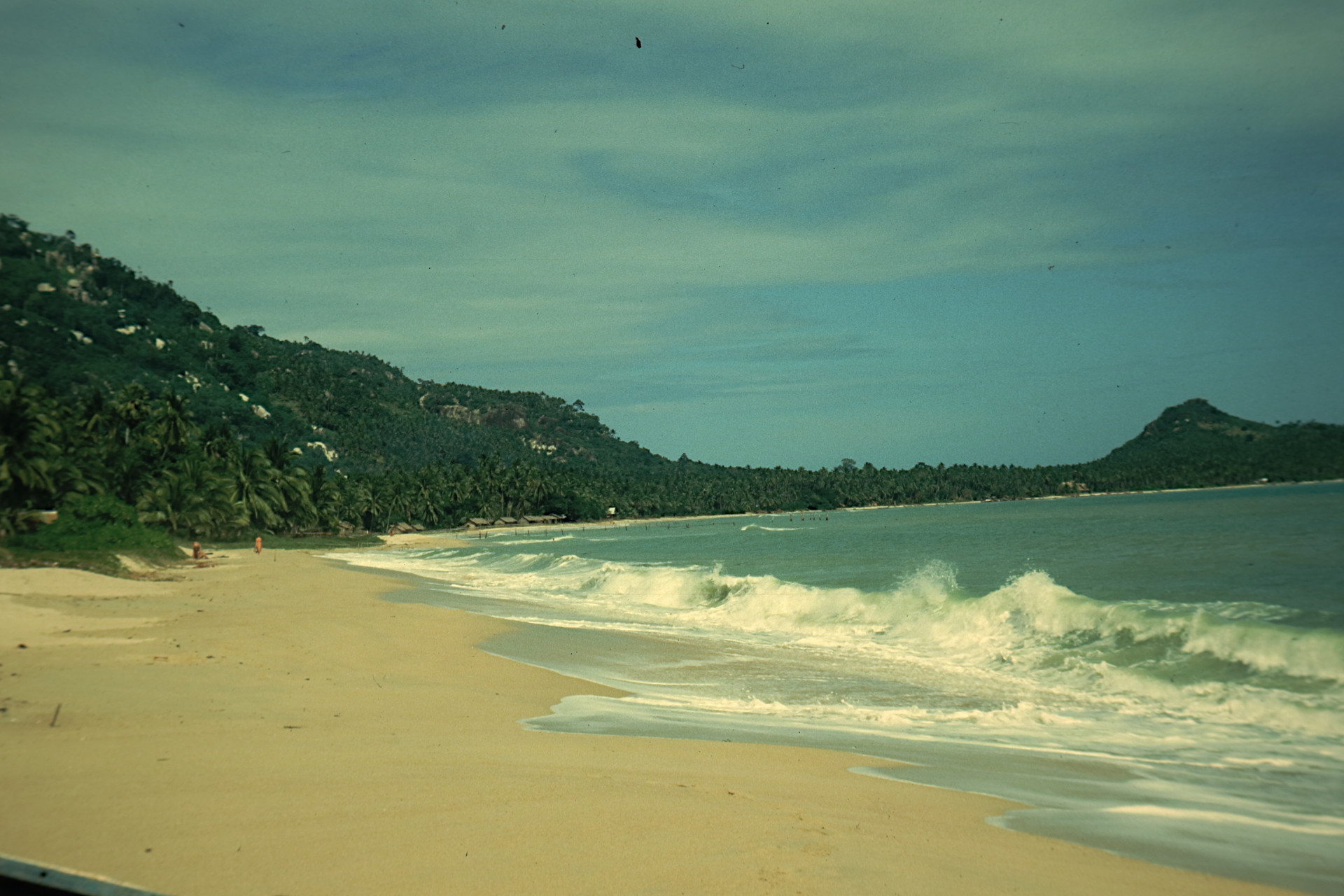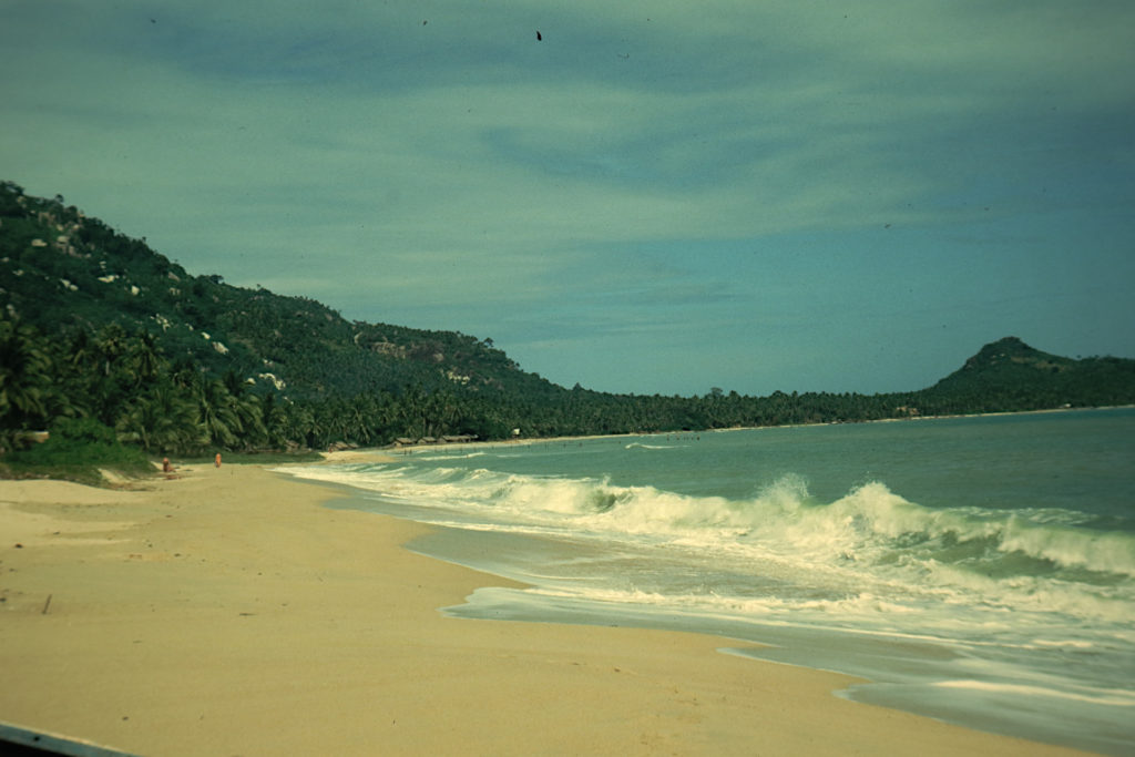 Das Foto zeigt den Strand (Lamai Beach). Erst bei genauerem Betrachten sieht man Personen und Gebäude. Auch hier erlauben die Berge eine einigermaßen präzise Bestimmung der Aufnahmeposition. Hier wieder der Link zu Google Streetview welches die heutige Situation zeigt.