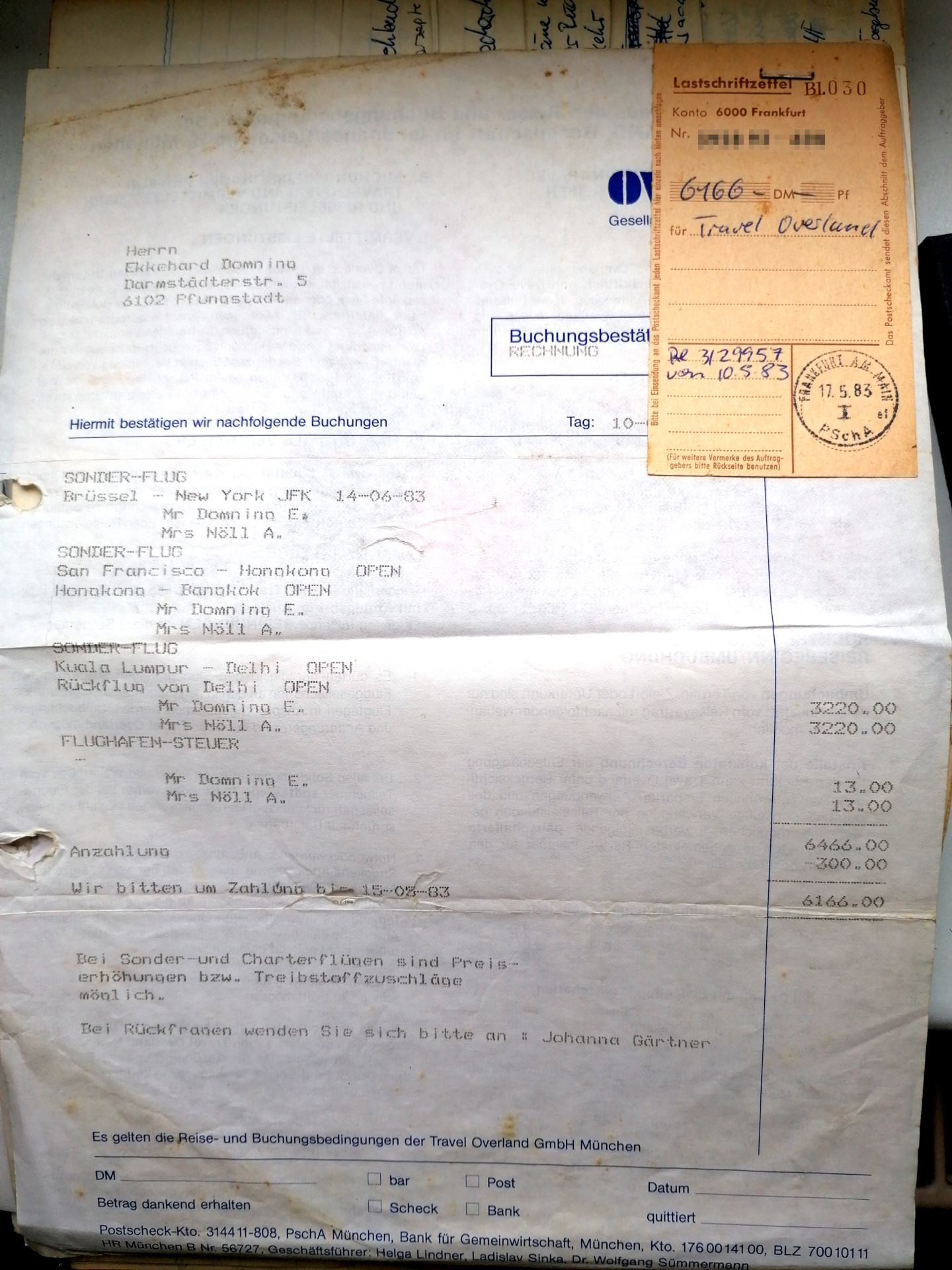 Vermutlich haben wir schon in München die auf der Rechnung erwähnte Anzahlung von 300 DM geleistet. Wie auch immer die Rechnung kam mit knappem Zahlungsziel und zur Überweisung musste ich einen Brief zum Postscheckamt nach Frankfurt schicken. Dieses führte dann die Überweisung aus und schickte mir dann den abgestempelten Beleg zurück.