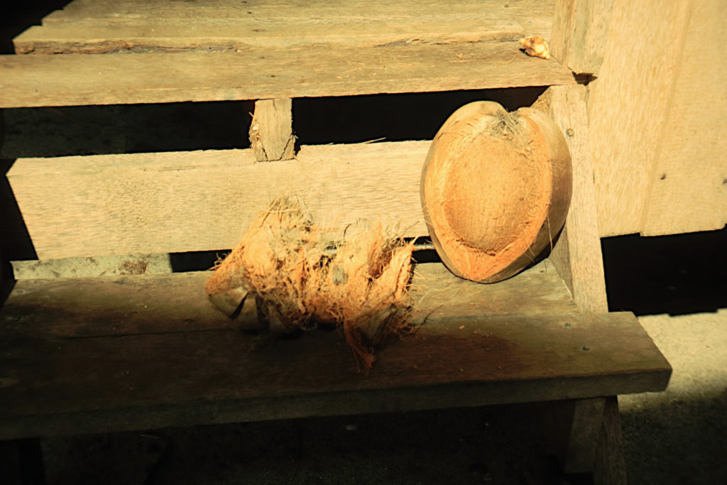 Das Foto zeigt das „Innenleben“ einer Kokosnuss, also die Fasern, die den eigentlichen Kern ummanteln und so die Reise der Frucht übers Meer und der Ausbreitung der Pflanzen erst ermöglichen. Diese Hülle wird entfernt, bei uns kommt nur der Kern in den Handel. Die ganze Insel lebte (neben dem Fischfang) vor dem Tourismus von der Verarbeitung der Kokosnüsse.