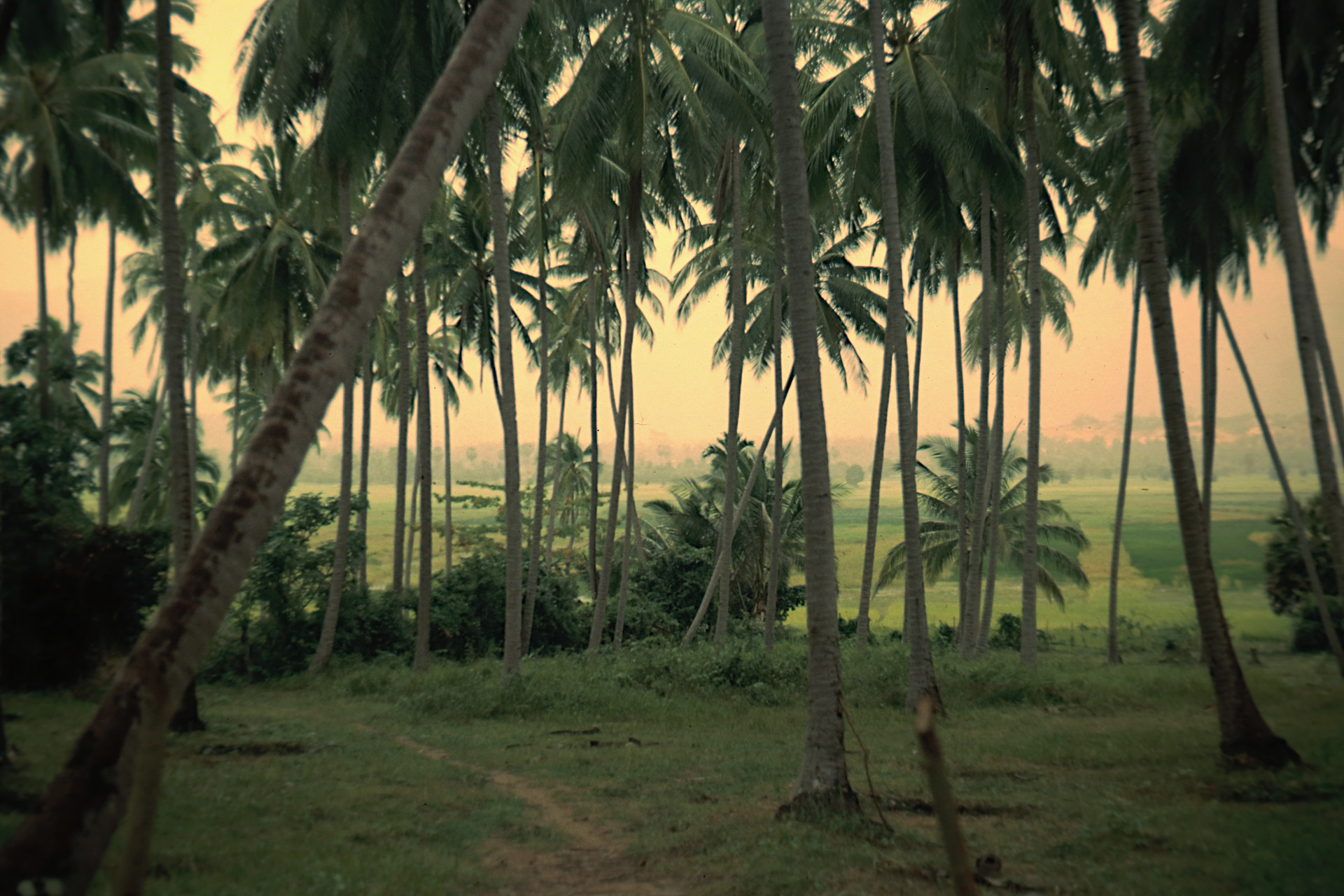 Anmerkung: Das Bild zeigt einen der vielen Palmenhaine auf der damaligen Insel. Die Produktion und Verarbeitung von Kokosnüssen und all ihrer Erzeugnisse (Fasern, Öl, Kokosraspel, usw.) nahm einen großen Platz ein, da der Tourismus noch nicht so weit gediehen war. Zur Ernte der Nüsse wurden auch Affen eingesetzt, die an langer Leine die Palmen hochklettern und die reifen Nüsse ernten mussten.