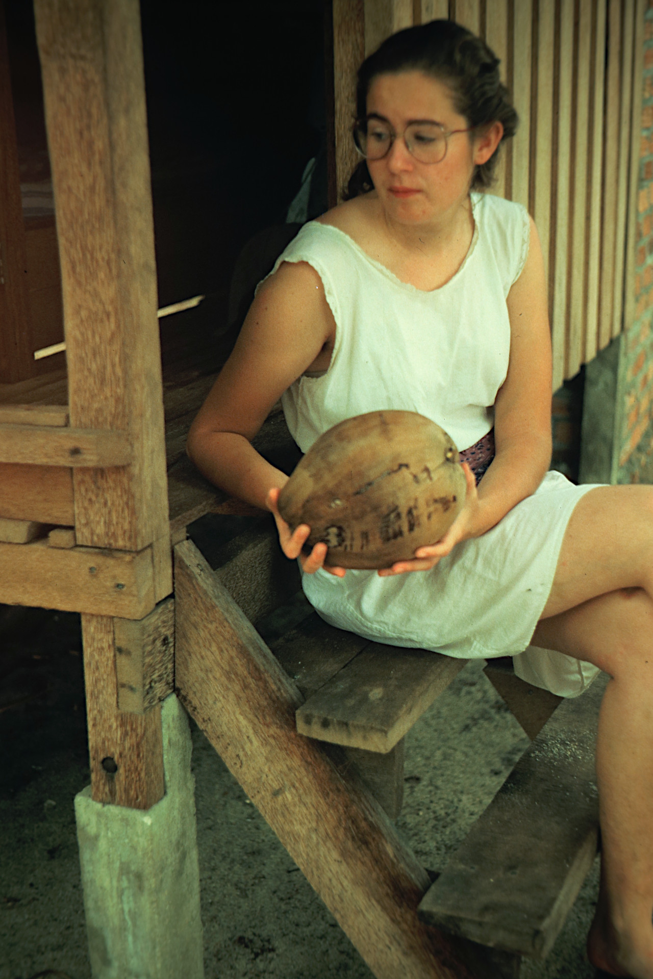 Das Foto zeigt Anne, wie sie auf den Stufen zu unserem Bungalow, eine nachts vom Baum gefallene Kokosnuss präsentiert. Im Digitalzeitalter hätte man gesagt: „Jetzt nochmal und ein hübsches Lächeln, bitte“.