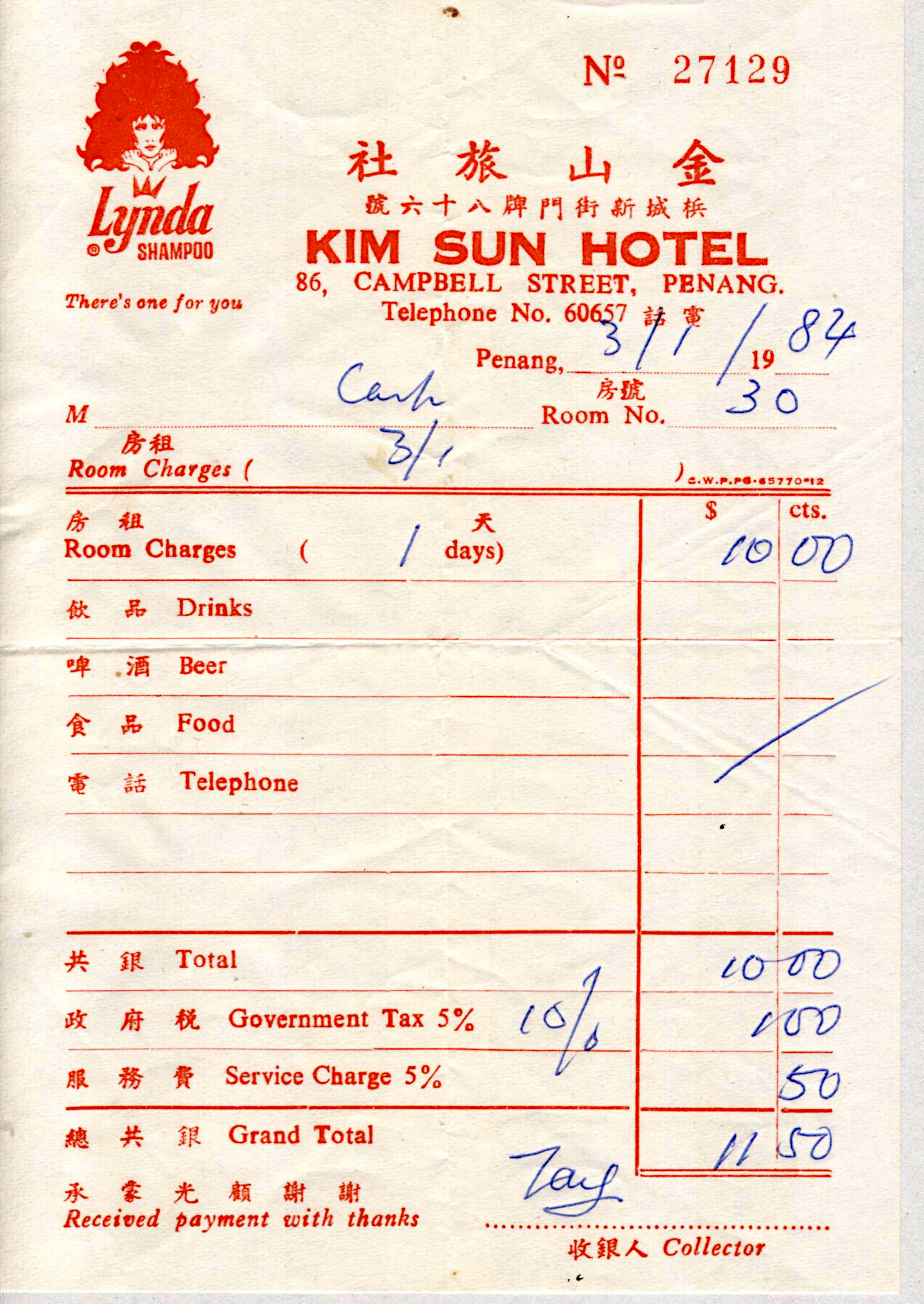 Morgens wurden die Pässe eingesammelt, Mittag fast 2 Std. vor der malayischen Immigration auf die Rückgabe gewartet, fast die letzten, dafür 1 Monats-Visa. Dann fast 1 weitere 1 Std. auf den Zoll gewartet, der sich bei der Gründlichkeit das Nachschauen hätte sparen können.Danach noch eine schier endlose Zugfahrt. Abends in Butterworth angekommen. Hetze zur Fähre, als fast erste wieder runter und mit einer Fahrradritschka (6$) auf Hotelsuche. Beim 3. Chinesen klappte es 1 Zimmer, recht sauber für 11,50 M$. Zum Essen gegangen irgendwo auf der Straße, für 2,60M$ unheimlich gut, scharf und genug. Bei der Rückkehr festgestellt, dass der Spion-Trick (Faden) keinen Erfolg hatte, d.h. keiner wollte in unser Zimmer rein!