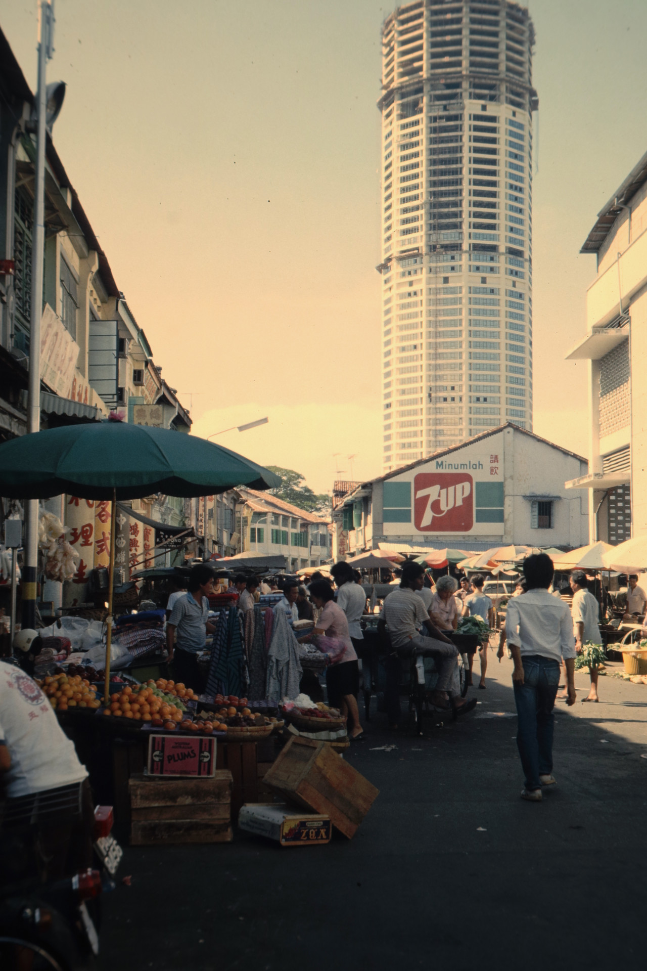 Anmerkung: Aus Malaysia gibt es überraschend wenige Fotos, aus Penang gesichert nur dieses eine (vielleicht ein weiteres, zeige ich in den kommenden Tagen). Das auffällige Hochhaus im Hintergrund ist der KOMTAR-Tower, damals wohl eher als „Penang New Urban Center“ bekannt. Zu dieser Zeit war es das höchste Gebäude in Südostasien und wurde 1986 von einem Gebäude in Singapur überholt. Es war lange in Bau und erlitt ein Jahr zuvor (Jan. 1983) einen heftigen Brand im oberen Gebäudeteil. Wo das Foto entstanden ist konnte ich nicht sicher herausfinden, zu viel hat sich in den 40 Jahren verändert. Das Wort „Minumlah“ ist auf Malayisch der Imperativ von trinken, das Schild sagt demnach „Trink 7-UP“.