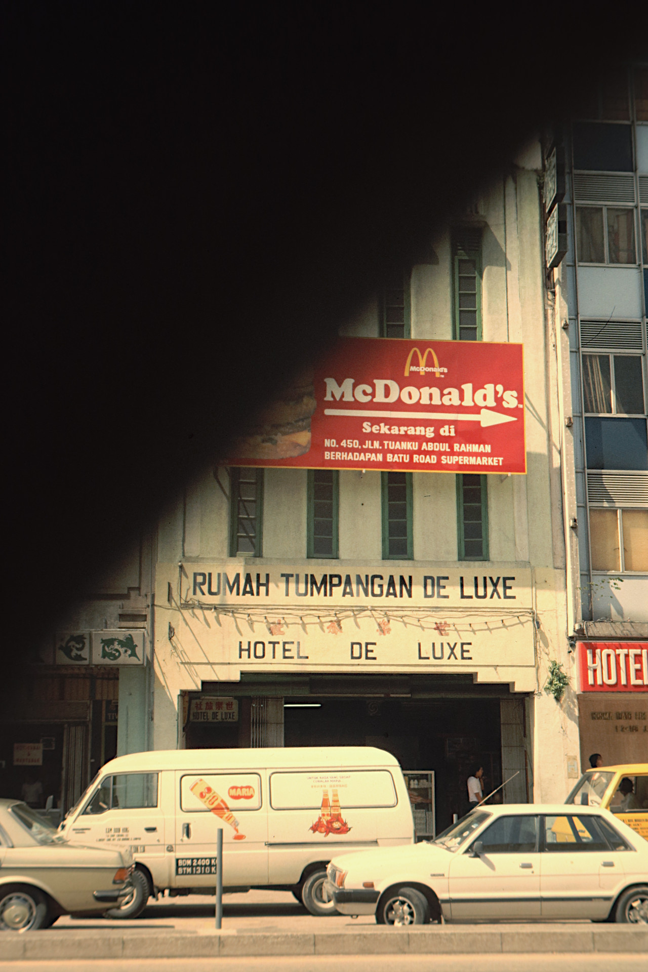Das Foto zeigt ein typisches Versehen der analogen Fotografie: Irgendwas ist immer zu Hälfte davor, natürlich ohne dass man das merkt. in diesem Fall vermutlich die Schutzhülle der Kamera. Den genauen Ort des Hotels kann ich nicht mehr genau bestimmen. Die Straße auf der Werbung dürfte es aber gewesen sein, denn die ist im „Treichler“ (Reiseführer „Südostasien selbst entdecken“) benannt.