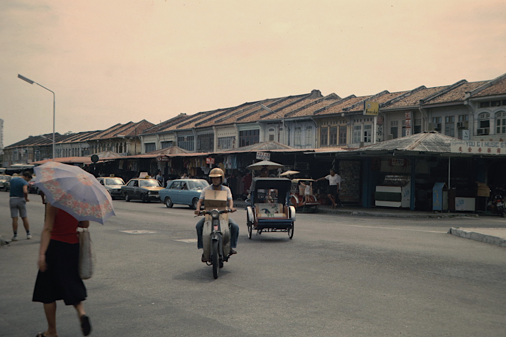 Das Foto zeigt eine typische Straßenszene. Kleine Häuser, diverse Transportgeräte, chinesische Händler. Ob es in Kulala Lumpur oder in Penang aufgenommen wurde kann ich nicht sagen.