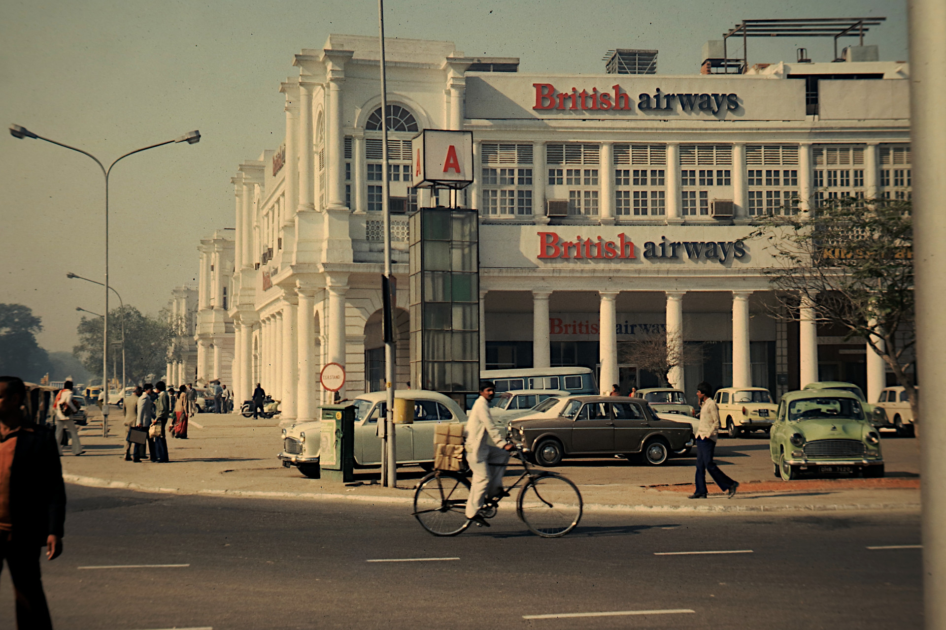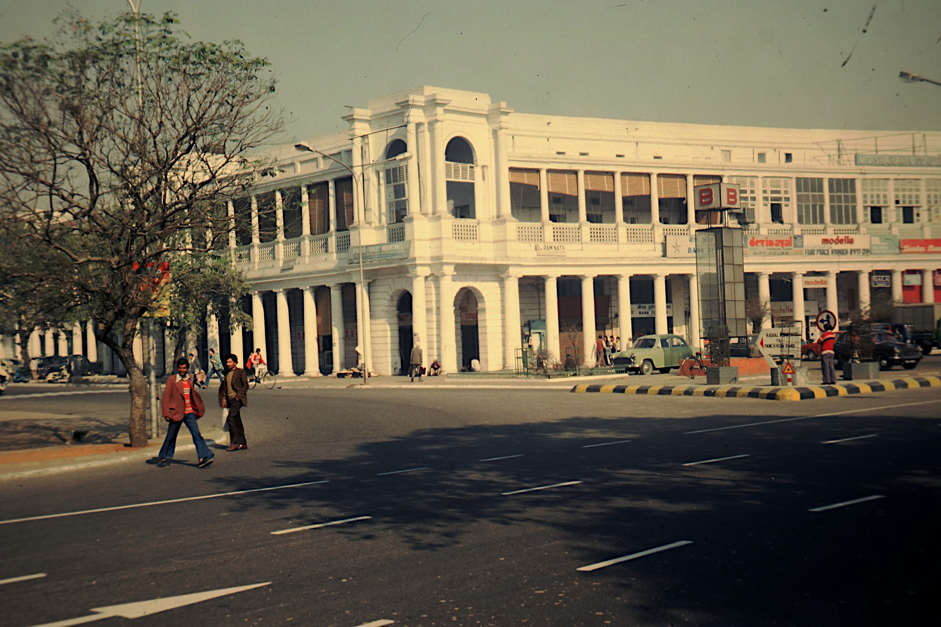 Die Fotos zeigein einen Teil des zentralen Platz von New Delhi, den Connaught Place, der nach dem Ersten Weltkrieg geplant und gebaut wurde. Er zählt heute zu den teuersten Geschäftadressen in der riesigen Stadt. Anhand der Pylone mit den Block-Angaben („A“, bzw. „B“) lassen sich die Aufnahmepositionen schön nachvollziehen. Die Autos, die auf den Fotos zu sehen sind, waren für uns damals schon Oldtimer. Aber die strikte Einfuhrkontrolle verhinderte, dass neuere Fahrzeuge ins Land kamen.