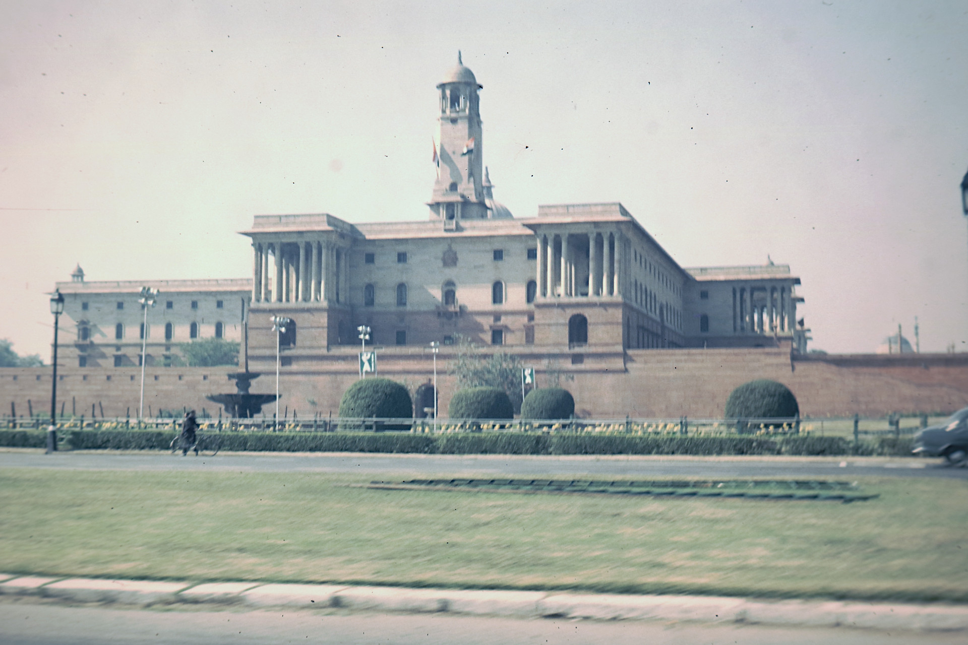 Das Foto zeigt einen Schnappschuss während der Vorbeifahrt an den imposanten Gebäuden der Indischen Regierung. Das Foto ist leider sehr überbelichtet und konnte mittels der heutigen digitalen Bearbeitungsmöglichkeiten in etwas Erkannbares verwandelt werden. Es zeigt den südlichen Block der beiden symmetrischen Gebäude-Komplexe.
