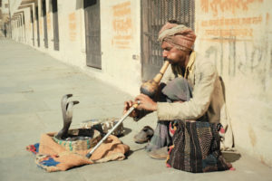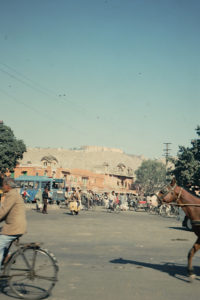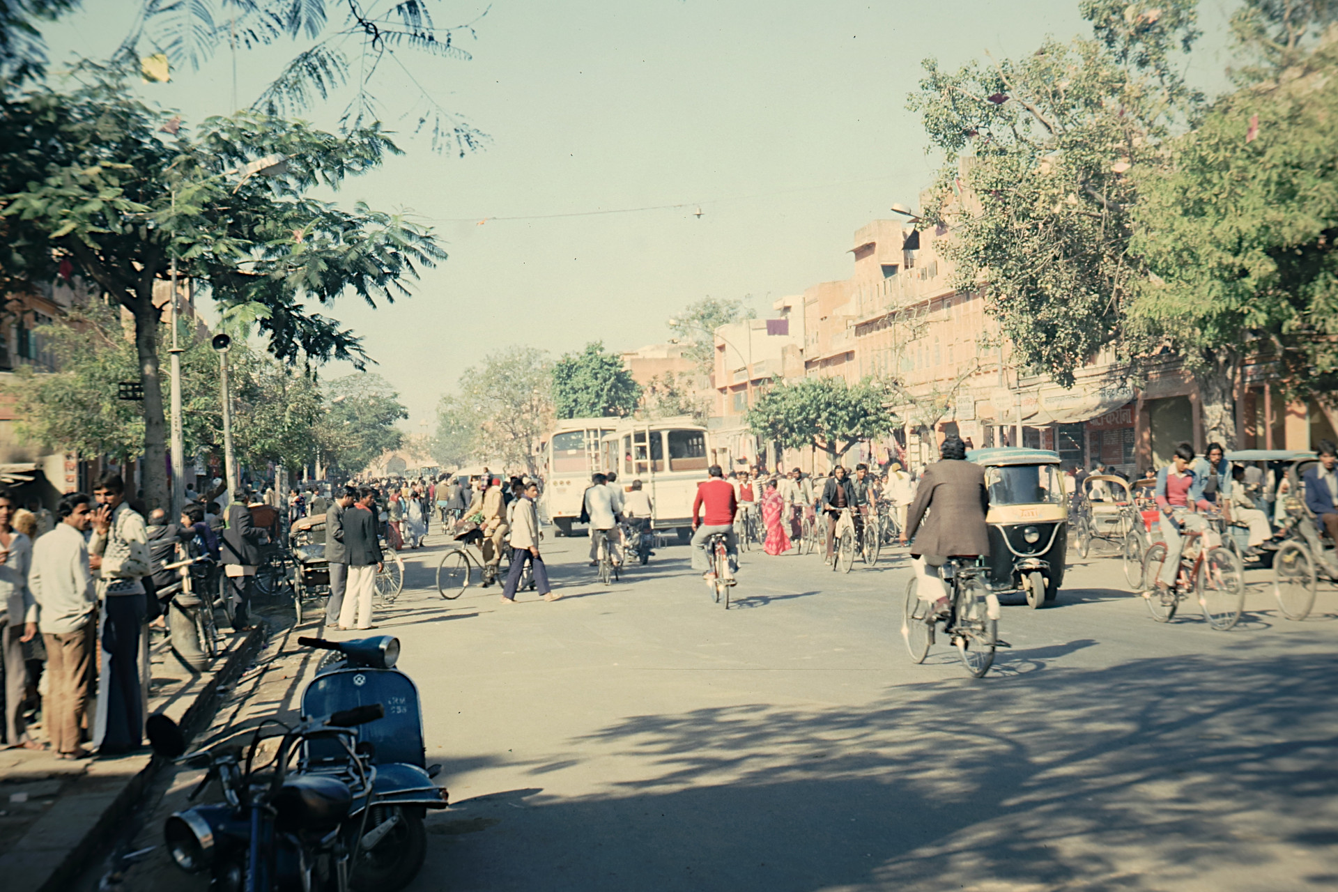 Nach der grässlichen Friererei endlich schöne Warme Sonne (Non Aircond.Bus!). Mit Ritschka zum „Jaipur Inn“, netter Typ, sauberes großes Zimmer, aber nur kalte Duschen. Unseren Bus nach Agra gebucht und mit der Fahrradritschka zum Mittelpunkt der „Pink City“. Totales Verkehrschaos! Alles durcheinander, geht nur mit „Augen zu“. Schlangenbeschwörer und wilde Affen am Observatorium. Durch die Wirrwar-Straßen zurück zum Hotel gebummelt. Viele arme bettelnde Leute + Kinder! Etwas geschlafen und geduscht. Abends für 10Rs each ganz gut gegessen und Tee getrunken. Über Büsingen geschwätzt.