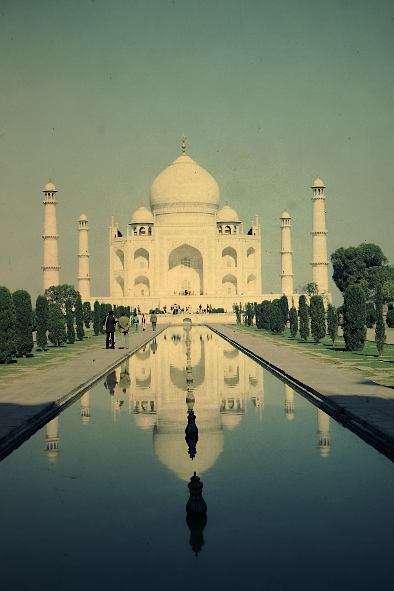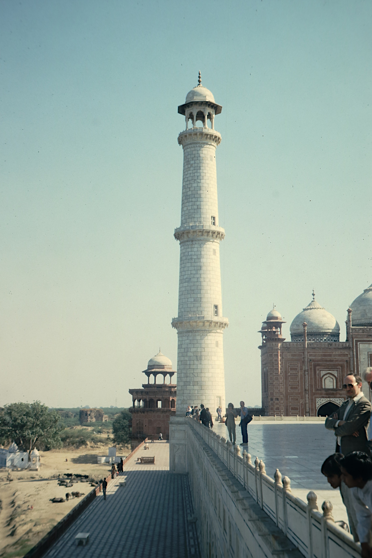 Das eine Foto zeigt den Turm des Mehtab Bagh (etwa „Mondlicht-Garten“), auf der anderen Seite des Flusses. Dort sollte gerüchteweise das schwarze Gegenstück zum weißen Taj Mahal entstehen. Das Foto des Taj Mahal ist leider überbelichtet und konnte nur teilweise gerettet werden.
