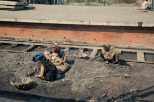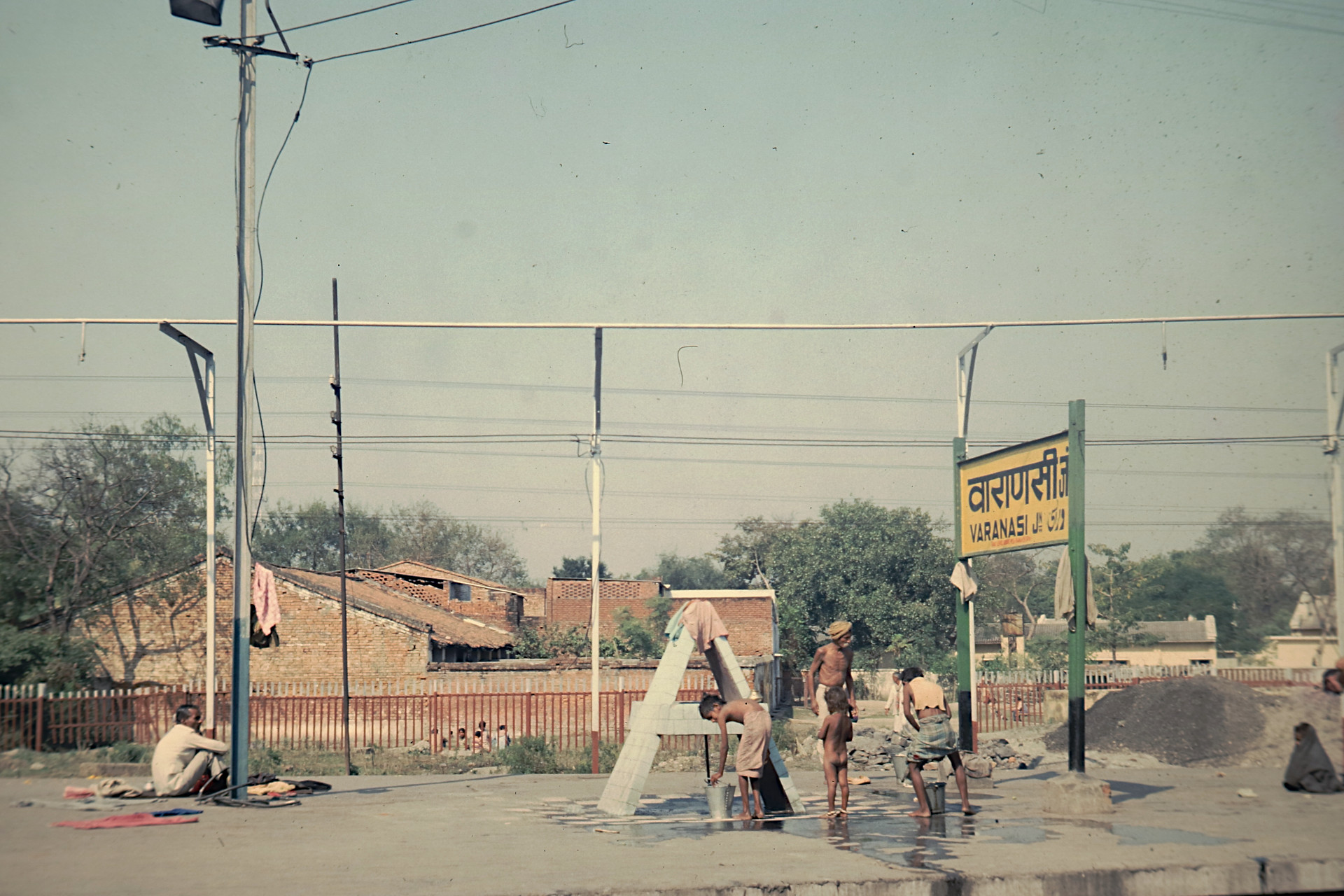 Die Fotos zeigen oben den morgendlichen Fluss, vor und nach dem wunderbaren Sonnenaufgang. Die unteren Bilder die Ghats und eine Situation am Bahnhof, sowie Bilder von unterwegs (bei denen ich nicht sagen wann und wo sie aufgenommen wurden). Die beiden Bahnhofsbilder überlappen sich, in der einen Ecke. Die Arbeit der Frauen bestand darin, die restlichen Kohlestückchen aus dem Gleisbett zu sammeln, während die Männer auf dem Bahnsteig offensichtlich der Körperpflege nachgingen. Ich war immer sehr vorsichtig wenn ich Menschen fotografierte, an dieser Stelle wähnte ich mich im Zug sicher.