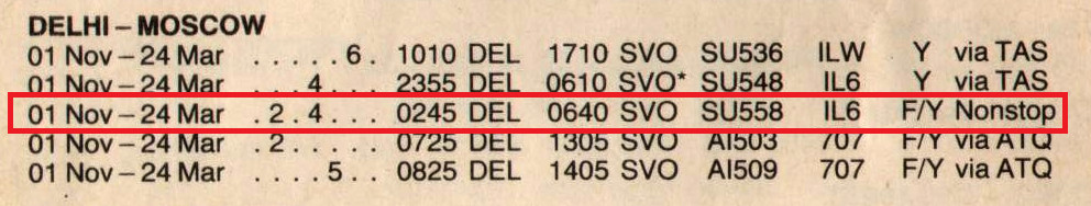 Das obere Foto zeigt den in Varanasi erworbenen Brokatläufer. Das untere zeigt den Ausschnitt aus dem Flugplan von Aeroflot. Der Flug nach Moskau startete um 2:45 am folgenden Tag und war wieder eine Iljushin IL-62. Ankunft in Moskau Ortszeit 6:40.