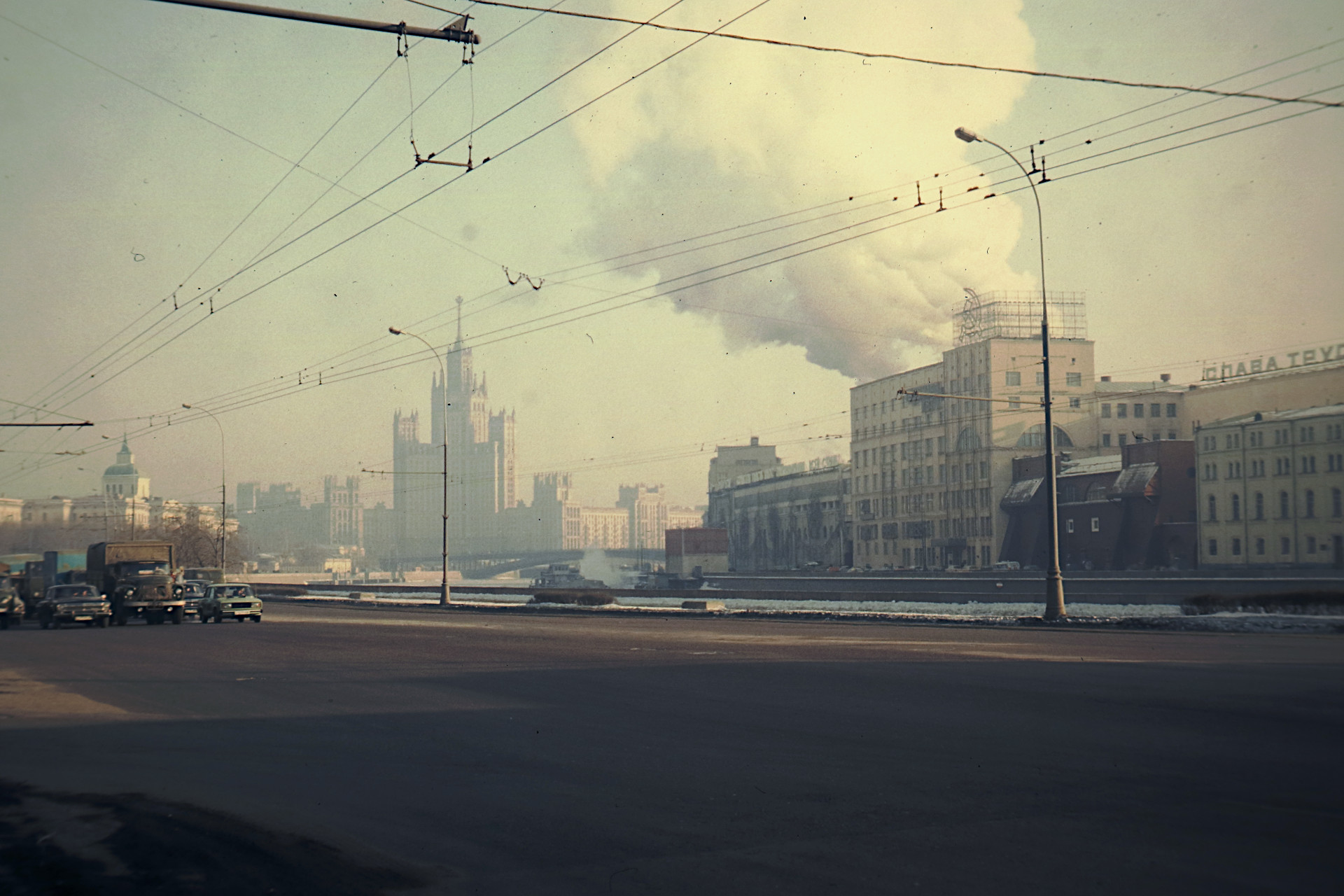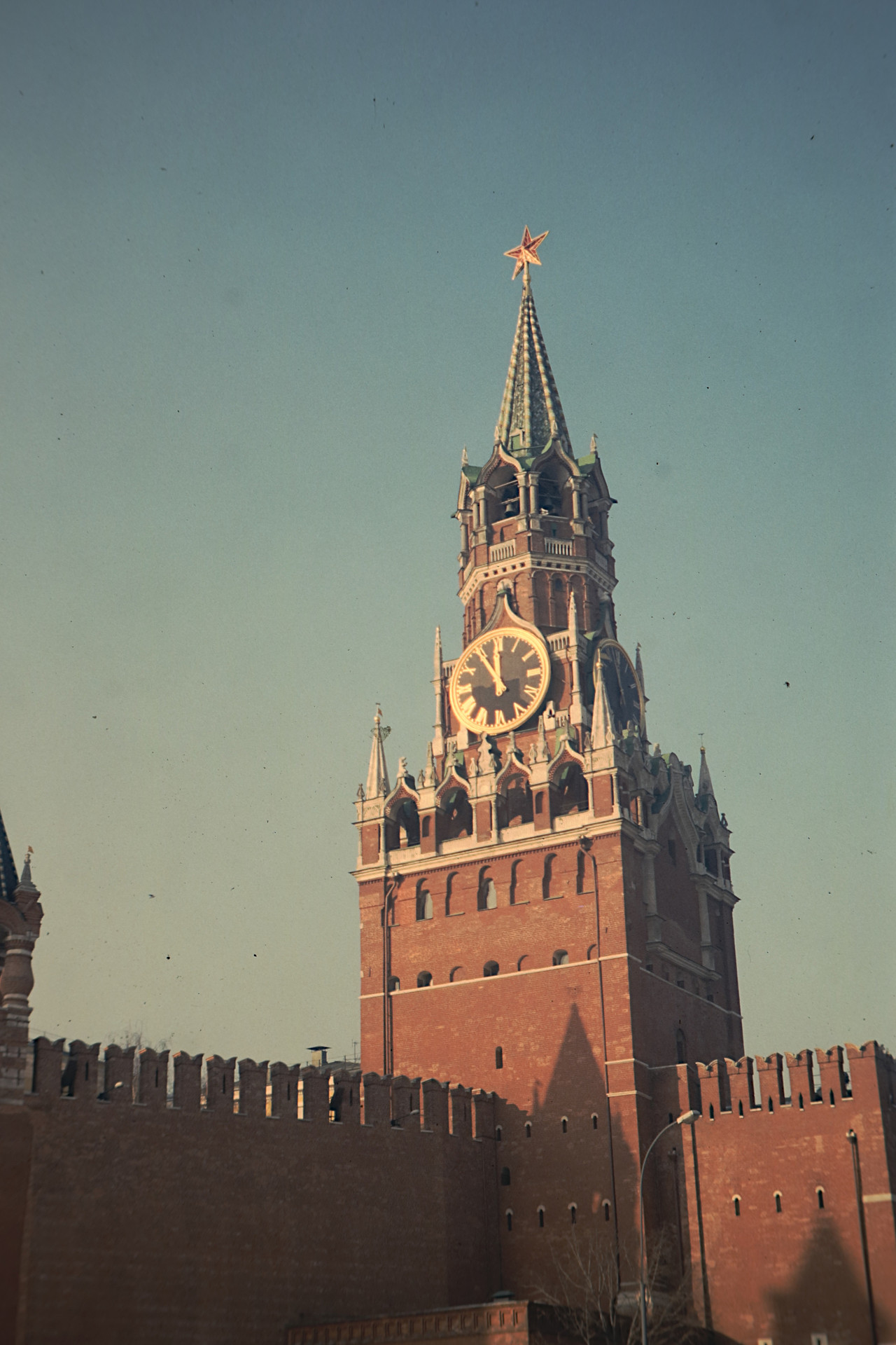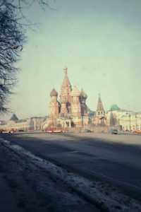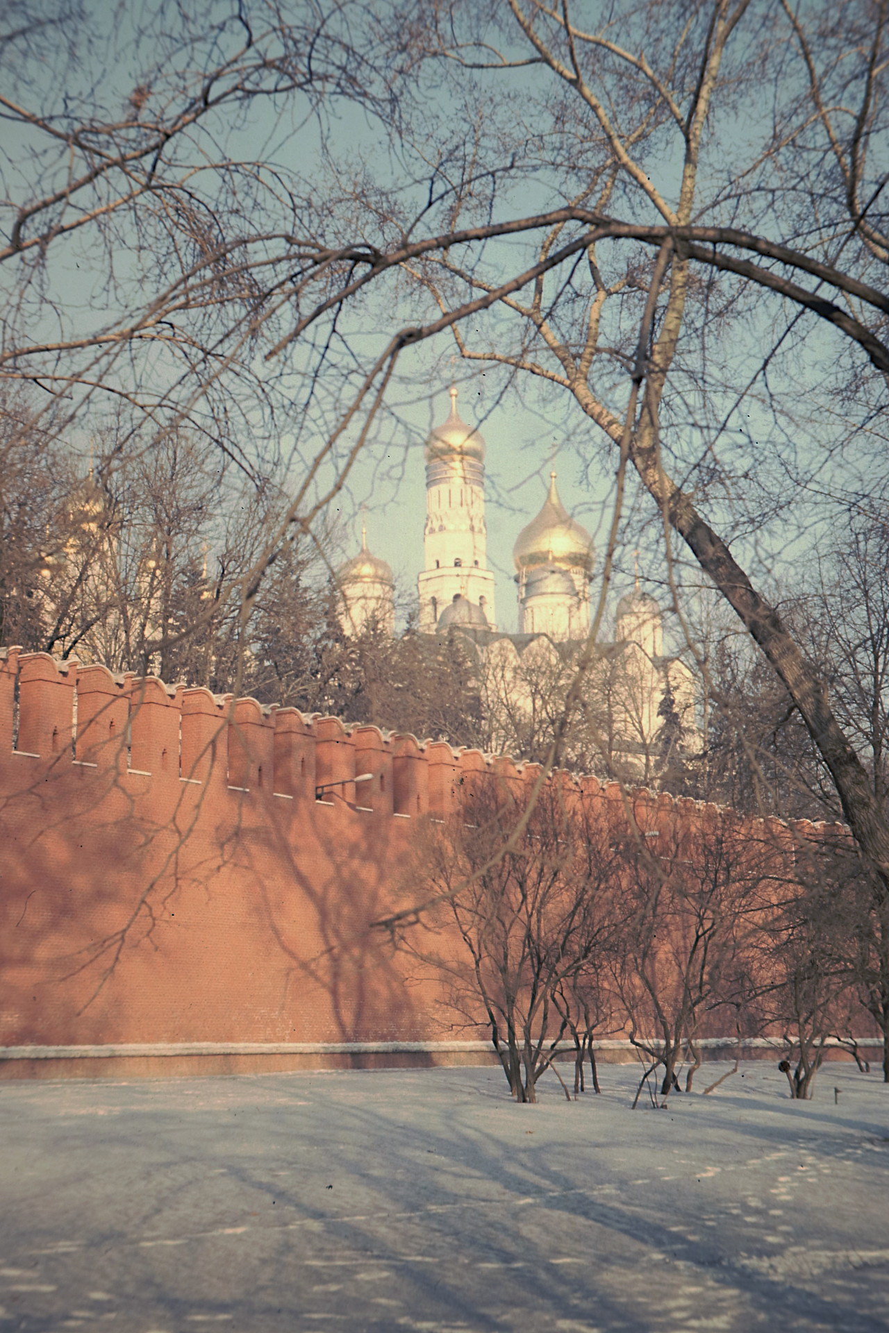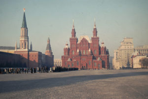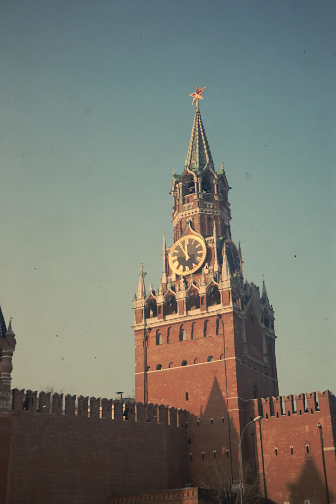 Die Bilder zeigen den Rundgang über den tiefwinterlichen Roten Platz, den Kreml und angrenzende Bereiche. Wir warteten extra in der Kälte, bis die Uhr auf dem Erlöserturm auf „Fünf vor Zwölf“ sprang, um ein wirklich symbolisches Foto zu machen. Die übrigen Fotos zeigen das Historische Museum am Nordende und den Senatspalast des Kreml. Man beachte die lange Warteschlange der Menschen die in das Lenin-Mausuleum eintreten wollen. Dann die Basilius Kathedrale, einen Blick über die Moskwa zum Wohnhaus an der Kotelnitscheskaja-Uferstraße im Zuckerbäckerstil, von dem wir damals annahmen, es sei die Parteizentrale der KPdSU. Ebenfalls zu beachten das große Hammer-und-Sichel-Symbol auf dem Kraftwerk. Die letzten beiden Fotos zeigen den Blick über die Kremlmauer mit den Türmen der mehrerer dahinter liegender Kirchen und Anne in einem der angrenzenden parkähnlichen Grünanlagen auf dem (Rück-?)Weg zur bzw. von der Leninbibliothek, die nicht weit entfernt ihren Sitz hatte (heute Staatsbibliothek).