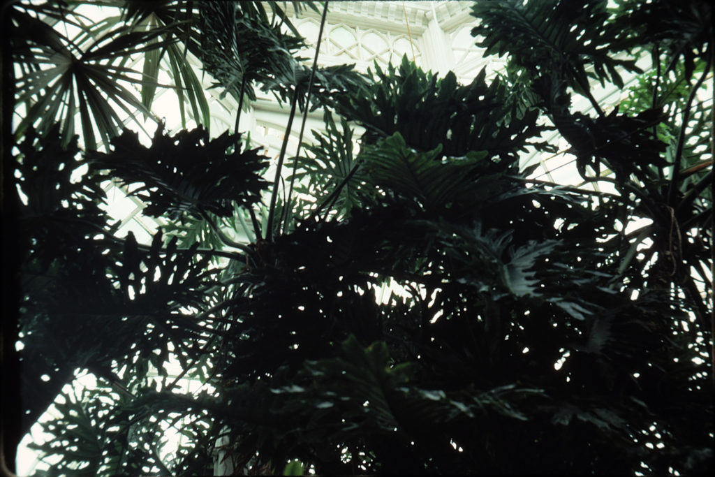 Das Foto zeigt im Übrigen auch die gewaltige Dynamik, also den Umfang der unterschiedlichen Belichtungen in einem Bild, die die analoge Fotografie hat. Um das Dia einigermaßen abzubilden, so dass es dem Eindruck im Projektor entspricht, war erheblicher Aufwand nötig. So musste ich drei digitale otos mit drei uneterschiedlichen Belichtungen machen und diese als „HDR“ zusammenfügen. Nur so lassen sich die Nuancen in den dunklen Teilen der Blätter und der Hintergrund des Glasdaches gemeinsam abbilden.