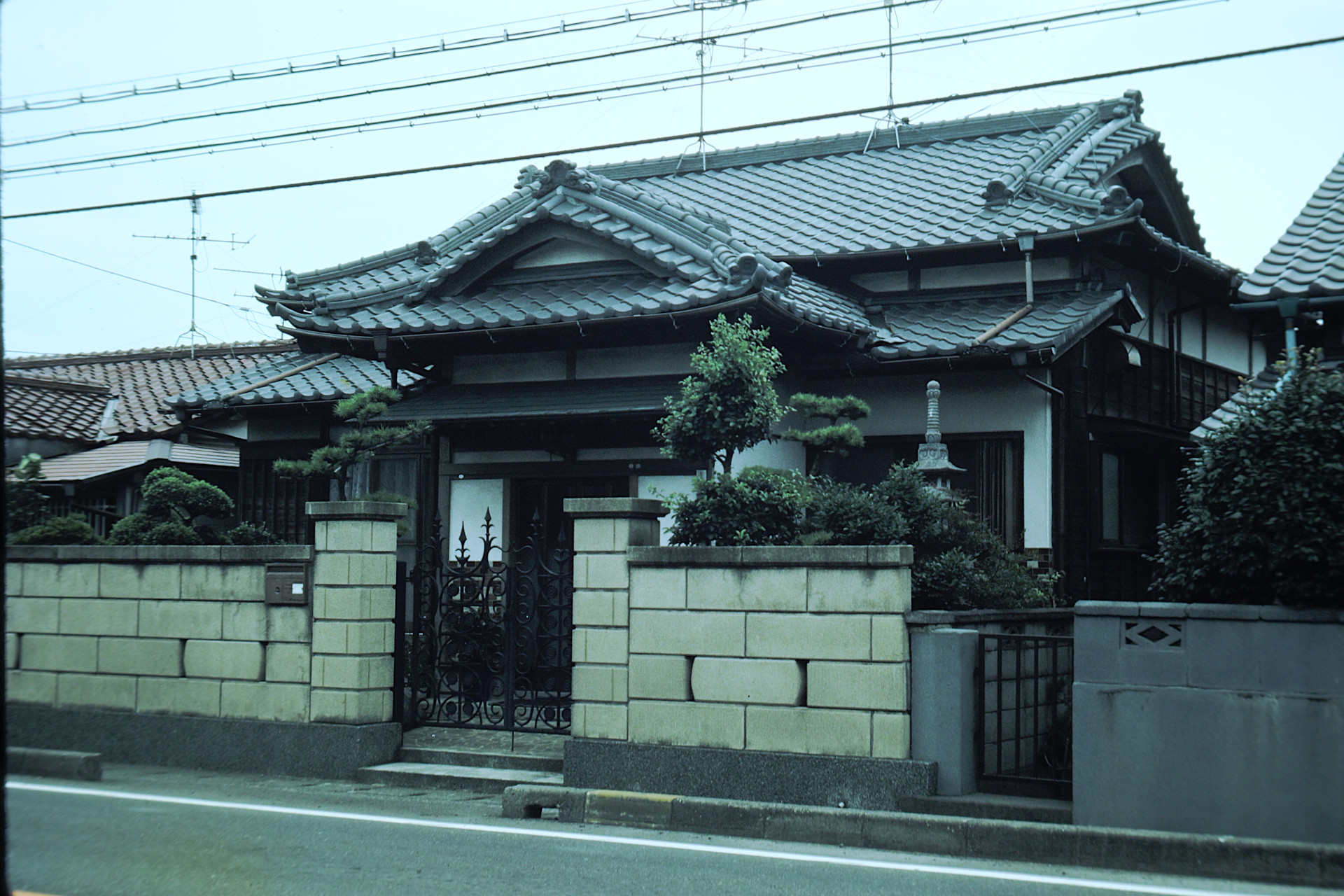 Mit der „1“ ist die Nationalstraße 1 gemeint, die vermutlich (ich erinnere mich nicht) teilweise als autobahnähnliche Straße ausgeführt wurde und damit für Radfahrer gesperrt war. Ein Foto von genau diesem Tag gibt es nicht. Das gewählte Foto zeigt eines der „besseren“ typischen japanischen Häuser. Uns begeisterte die schöne Gestaltung der Dächer.