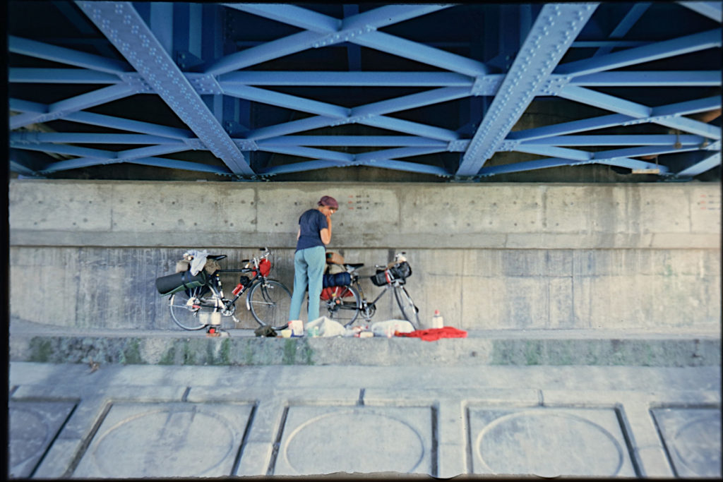 Um 5:00 aufgestanden und gefrühstückt, noch etwas mit dem alten Mann geschwätzt, dann losgefahren. Erst war es schön, wenn auch anstrengend durch die Stadt. Mit der Zeit wurde es immer heißer. Wir haben versucht nach Hause anzurufen, aber wie immer nur 3 Minuten, dann müssen wir doch was anderes uns einfallen lassen. So gegen 11:45 haben wir uns unter eine Brücke begeben und bis 15:00 Mittagspause gemacht wegen der Hitze.